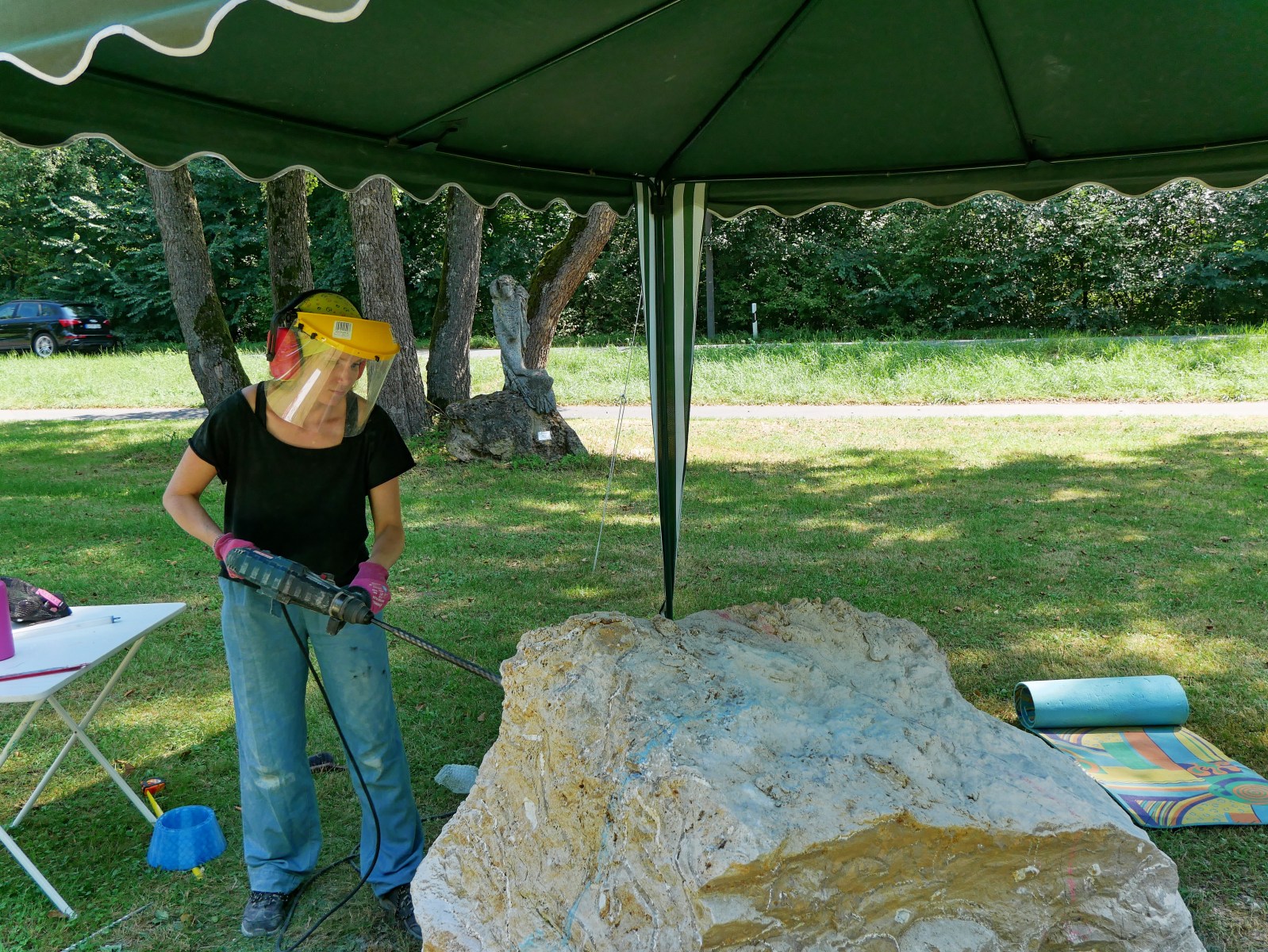 Môj cieľ bol priniesť do klasického sochárstva nejakú interakciu a to, že i bez prívodu elektriny sa dá vytvoriť dielo, ktoré diváka prinúti k nejakej akcii. Trochu ma unavuje, že umelecké diela sú určené do vitríny. Snažím sa túto bariéru búrať práve interakciou a postaviť diváka do inej role. Kameň som na troch miestach prevŕtala skrz. Musím však povedať, že tamojší vápenec mi dal trochu zabrať, predsa len som vyrástla na našom pieskovci, ktorý je oproti bavorskému vápencu niečo ako maslo. Doslova som si na tom vylámala zuby. Tak dúfam, že ma ten kameň aspoň prežije. Viac-menej sa mi podarilo do vápenca umiestniť aj tri megafóny z 3D tlače, ktoré fungujú podobne ako mušle. Majú človeka prilákať k počúvaniu kameňa a pohľadu skrz jeho vrstvy, nahliadnuť do jeho histórie alebo si ju vypočuť. Baví ma na tom aj parazitujúci plastový kus, ktorý vstupuje do horniny, ktorá to všetko prežije. Plast za nejakú dobu degraduje, ale kameň tu bude ešte dlho po ňom.