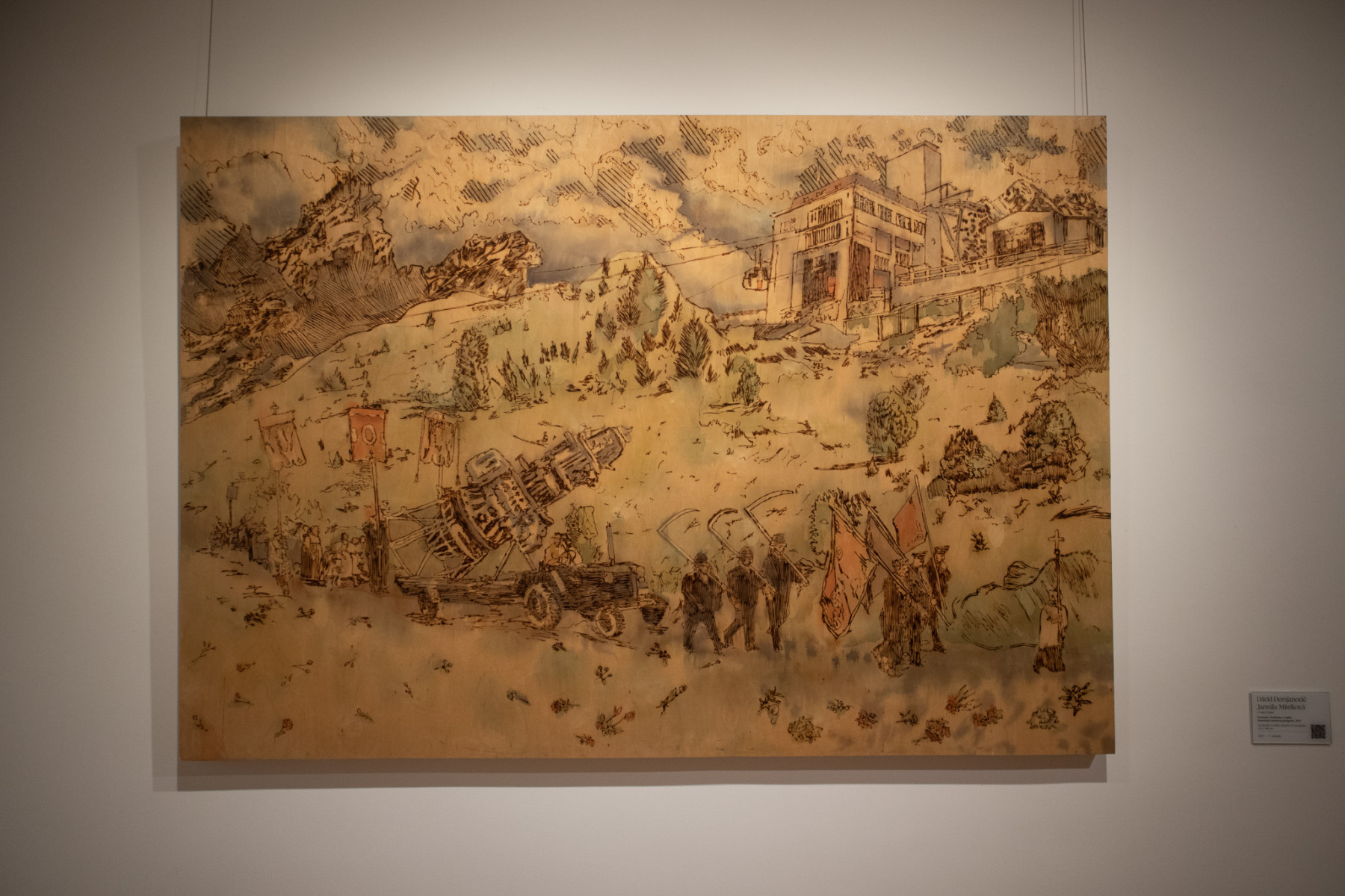 Dávid Demjanovič a Jarmila Mitríková: Procesia s družicou, z cyklu Slovenský vesmírny program, 2011, pyrografia a maľba lazúrami na preglejke, 180x125 cm. Maľba sa umiestnila v roku 2011 na 1. mieste. (foto: KUNSTARTUM)