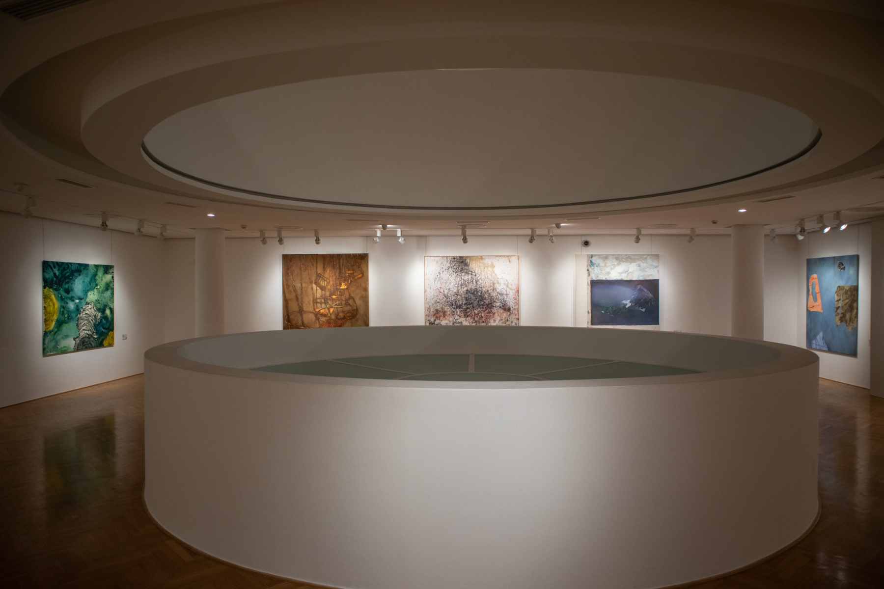 Zľava: Lucia Tallová: Zimný prístav, 2013, akryl na plátne, 220×190 cm. Maľba sa umiestnila v roku 2013 na 1. mieste; Marek Jarotta: Nemiesta – Hala, 2013, akryl na plátne, 200×140 cm. Maľba sa umiestnila v roku 2013 na 2. mieste; Alexandra Fazekašová: Svet („Život sa vždy začína od nuly“ – O.K.), 2009, akryl na plátne, 186×150 cm. Maľba sa umiestnila v roku 2009 na 3. mieste; Miroslav Sandanus: „SAFE“, 2024, akryl na plátne, 150×150 cm. Maľba sa umiestnila v roku 2024 na 1. meste; Ivona Žirková: Behind the Water Glaze, 2006, olej na plátne 120×120 cm. Maľba sa umiestnila v roku 2006 na 2. mieste. (foto: KUNSTARTUM)