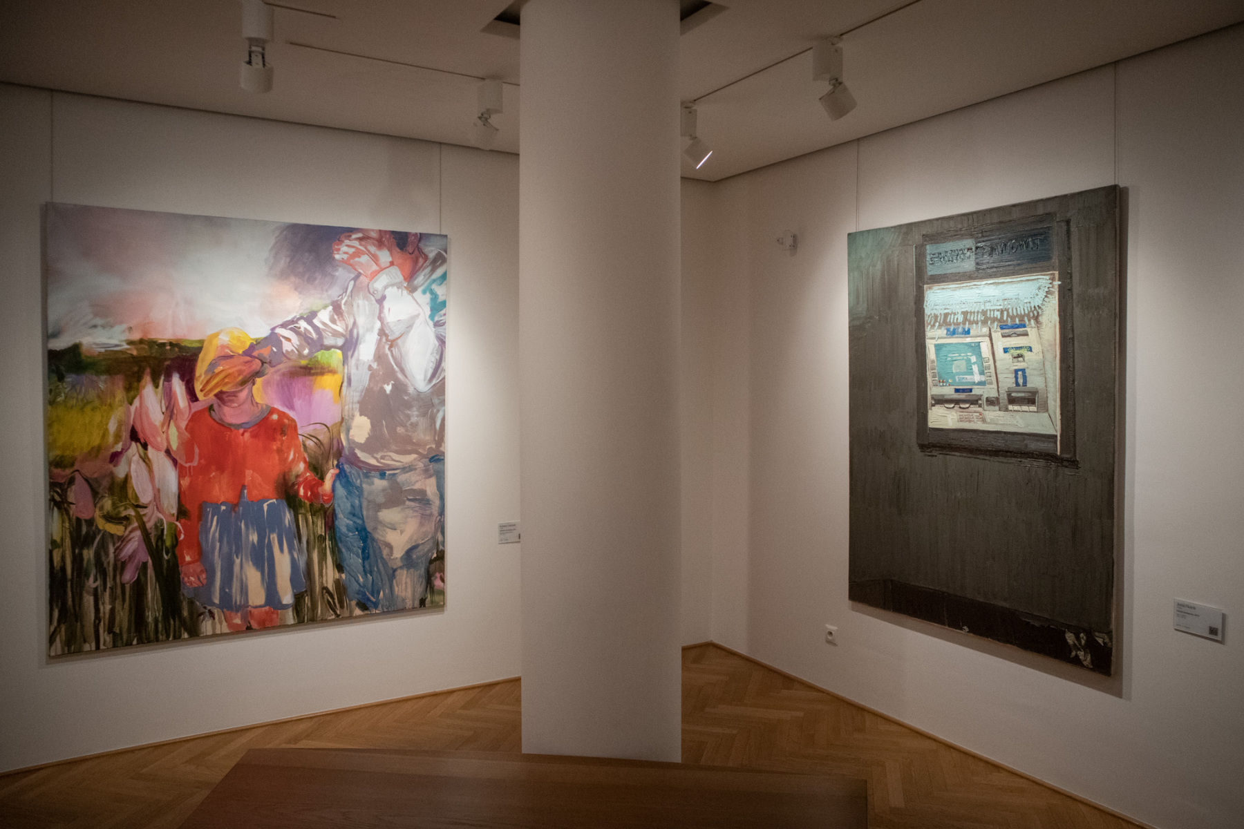 Vľavo: Kristína Navrátil: Rozhovor o predstave, 2016, akryl, sprej, tempera na plátne, 165x180 cm. Maľba sa umiestnila v roku 2016 na 1.mieste. Vpravo: Juraj Florek: Nočný bankomat, 2014, olej na plátne, 130x175 cm. Maľba sa umiestnila v roku 2014 na 1. mieste. (foto: KUNSTARTUM)