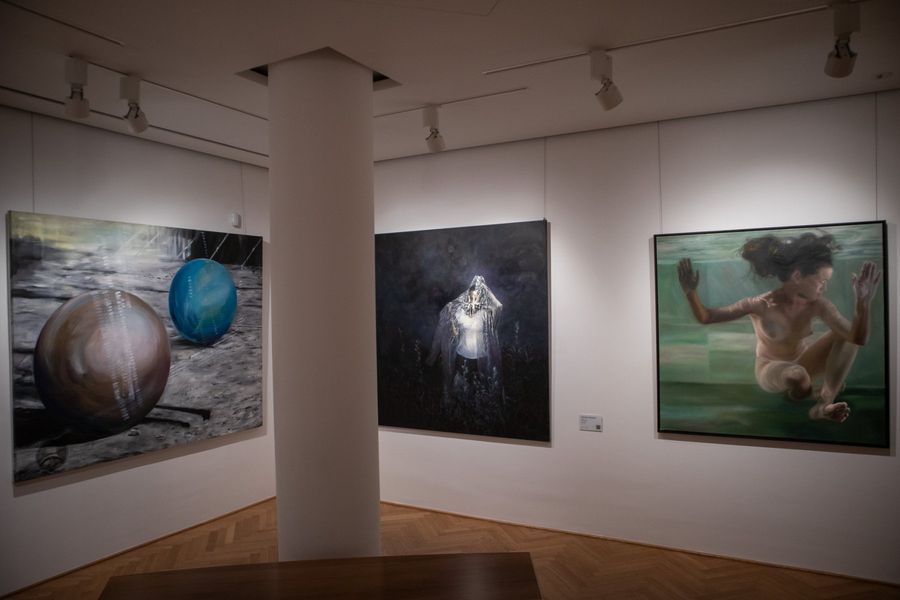 Vľavo: Alexandra Fazekašová: Svet („Život sa vždy začína od nuly“ – O.K.), 2009, akryl na plátne, 186x150 cm. Maľba sa umiestnila v roku 2009 na 3. mieste. V strede: Miroslav Sandanus: „SAFE“, 2024, akryl na plátne, 150x150 cm. Maľba sa umiestnila v roku 2024 na 1. meste. Vpravo: Ivona Žirková: Behind the Water Glaze, 2006, olej na plátne 120x120 cm. Maľba sa umiestnila v roku 2006 na 2. mieste. (foto: KUNSTARTUM)