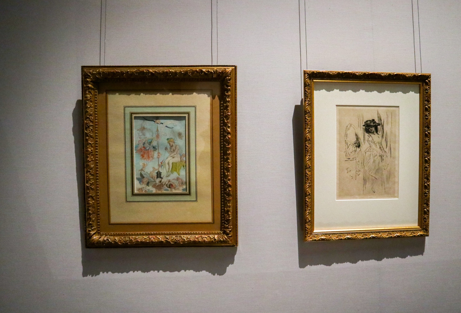 Vľavo: Félicien Rops, Kytherina váha, 1879-1881, Zbierky Valónsko-Bruselskej federácie; vpravo: Félicien Rops, Zrkadlo koketérie, nedatované, Zbierky Valónsko-Bruselskej federácie (foto: KUNSTARTUM)