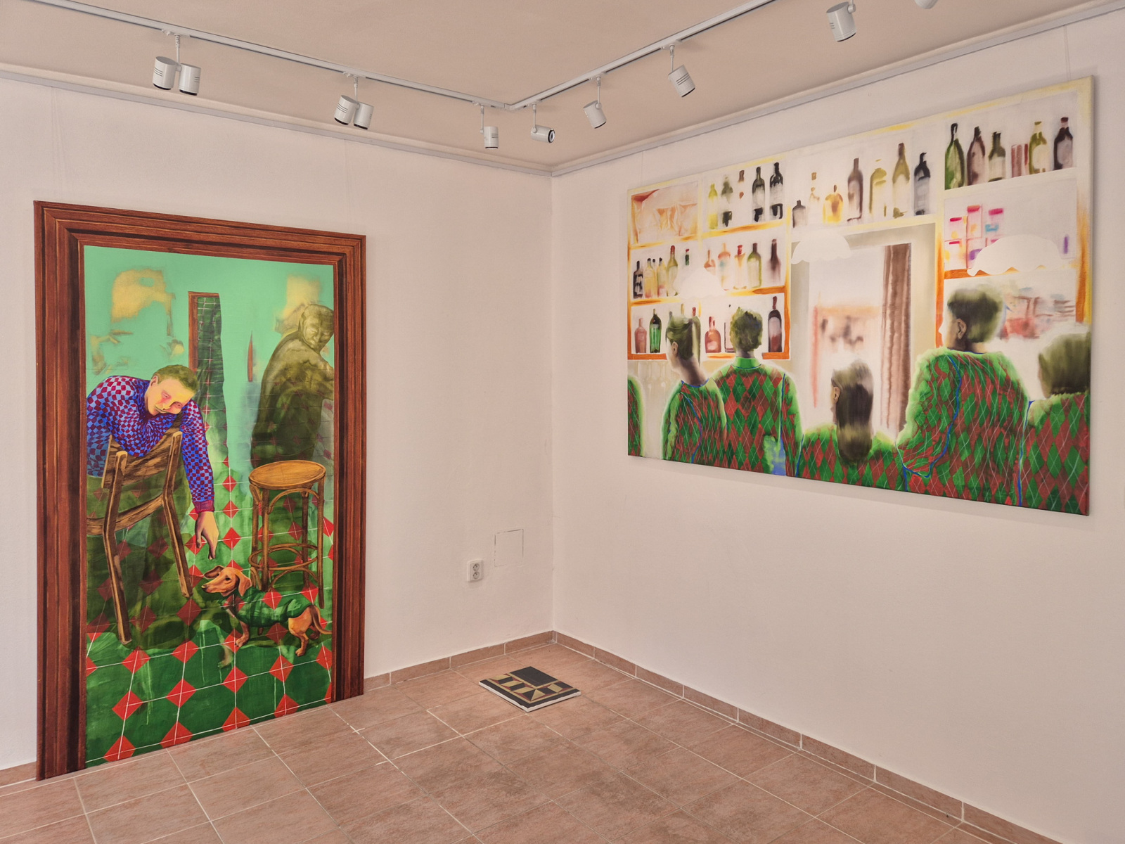Začnem tou vizuálnou stránkou. Ako návštevník som vstúpila do priestoru galérie, ale zrazu som sa ocitla akoby v zdvojenom priestore, kde mnohé maľby na mňa pôsobili dojmom optickej ilúzie dvoch interiérov. Alebo lepšie povedané, iný interiér bol prenesený do priestoru galérie pomocou obrazov. Inštalácie niektorých diel vytvorili akoby nový priestor. Maľby na dverách či vo vchode priam nútia okoloidúceho nakuknúť „do vnútra“ – do deja. Dielo Dvere umožňuje pohľad diváka do vnútra podniku akoby cez pomyselné sklo na dverách. To isté sa dá povedať o obraze Smutný chlapec, kde človek akoby cez otvorené dvere mohol pozorovať scénu odohrávajúcu sa v druhej miestnosti. Ilúziu nového priestoru dopĺňajú maľby fragmentov interiéru ako sú schody, či rôzne druhy vzoriek dlažieb a kachličiek. Striedajú sa tu veľké formáty malieb s malými.