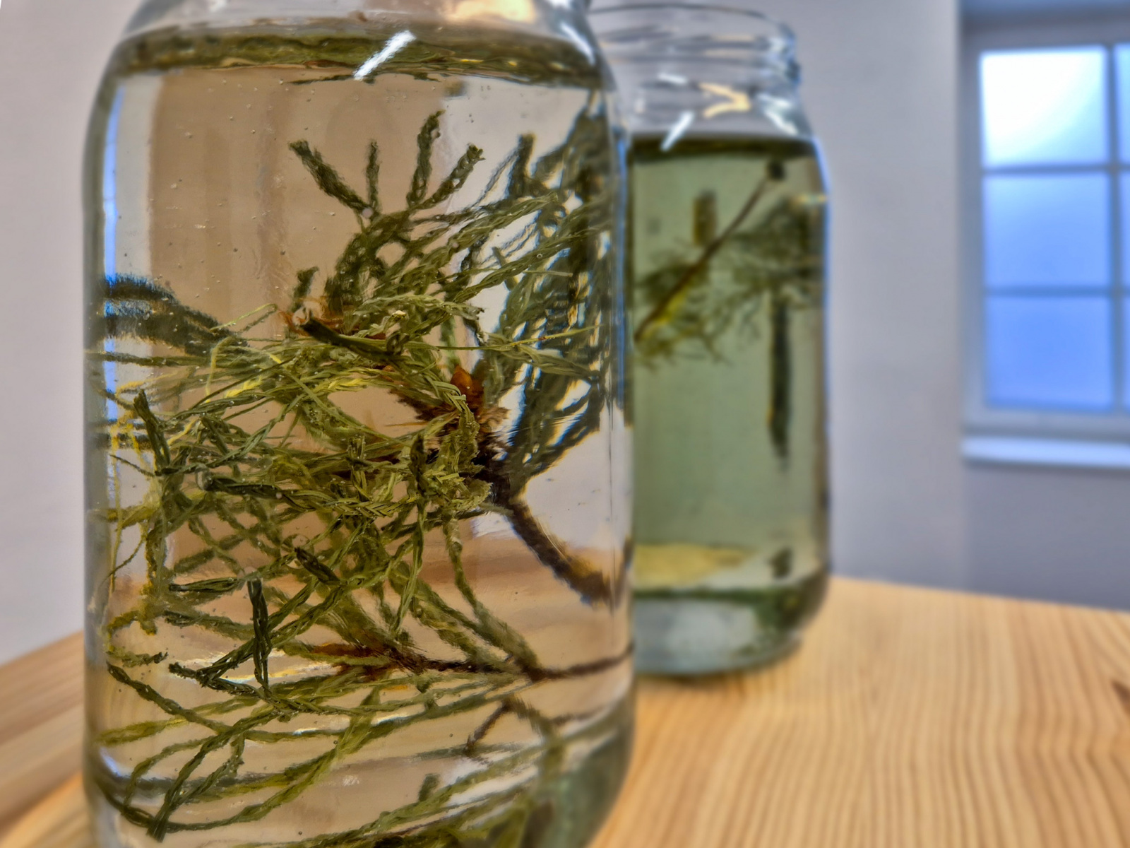 Helen Tóth: Florálne hybridy, 2024, objekt – prírodniny, živica, zaváraninové fľaše (foto: KUNSTARTUM)