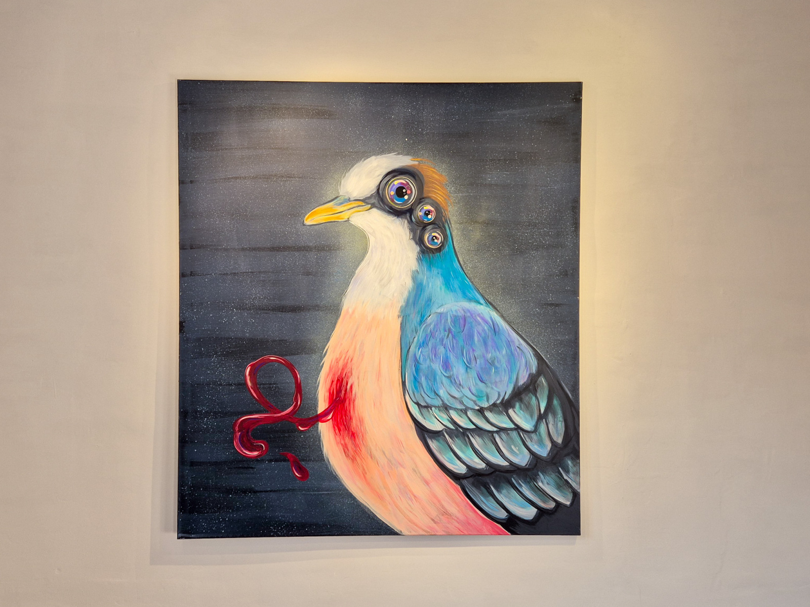 Obrazy zväčša plné sladkých farieb a roztomilých postavičiek na výstave Máme problémy, ale aspoň nie jeden narúšajú hrozivé scény. Odtrhnutá noha, všade tečúca krv, ktorej je viac ako pitnej vody, smerujúca k smrti, vojnou zničená stena príbytku, stíhačka a iná technika pripomínajúca boj – to všetko je koncentrované na maľbe Bloody voyage. Na pozadí so symbolmi známych zo sociálnych sietí, ktoré sa posledné roky stali nástrojom, či skôr zbraňou politickej moci takmer rovnako silnej ako tej skutočnej používanej v reálnej vojne. Bloody voyage možno označiť za najsilnejší obraz výstavy Máme problémy, ale aspoň nie jeden. Ďaleko za ním nezaostáva ani War, ktorý ukazuje postavu s chýbajúcimi končatinami.