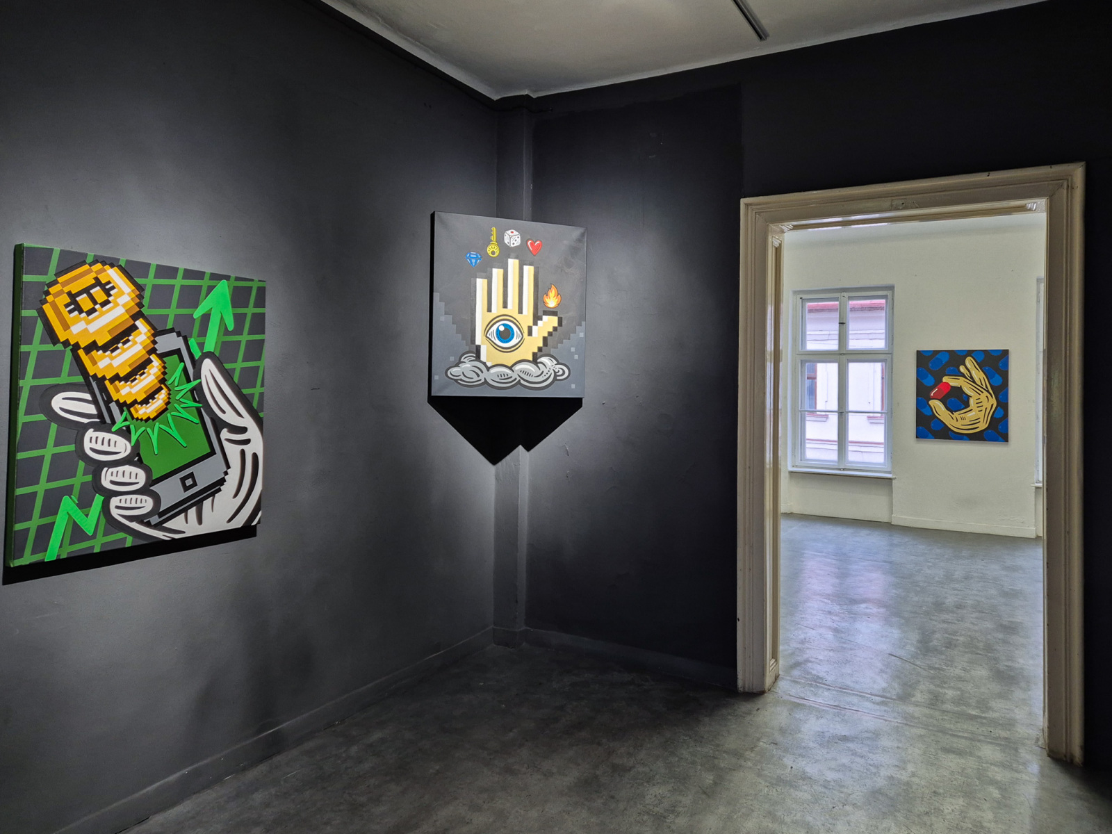 Prvýkrát som tu mala možnosť vidieť naživo spoločné diela Filipa Sabola a Matúša Maťátka. Obaja umelci majú svojrázny, ľahko zapamätateľný rukopis. Ak človek pozná tvorbu oboch, tak veľmi ľahko na spoločných dielach spozná, ktorú časť aký umelec vytvoril. Kým u Filipa prevláda geometrický štýl, u Matúša sú zas očividné hrubé línie pripomínajúce drevoryt. Spoločne sa však tieto dva rukopisy nebijú, práve naopak, pekne sa dopĺňajú.