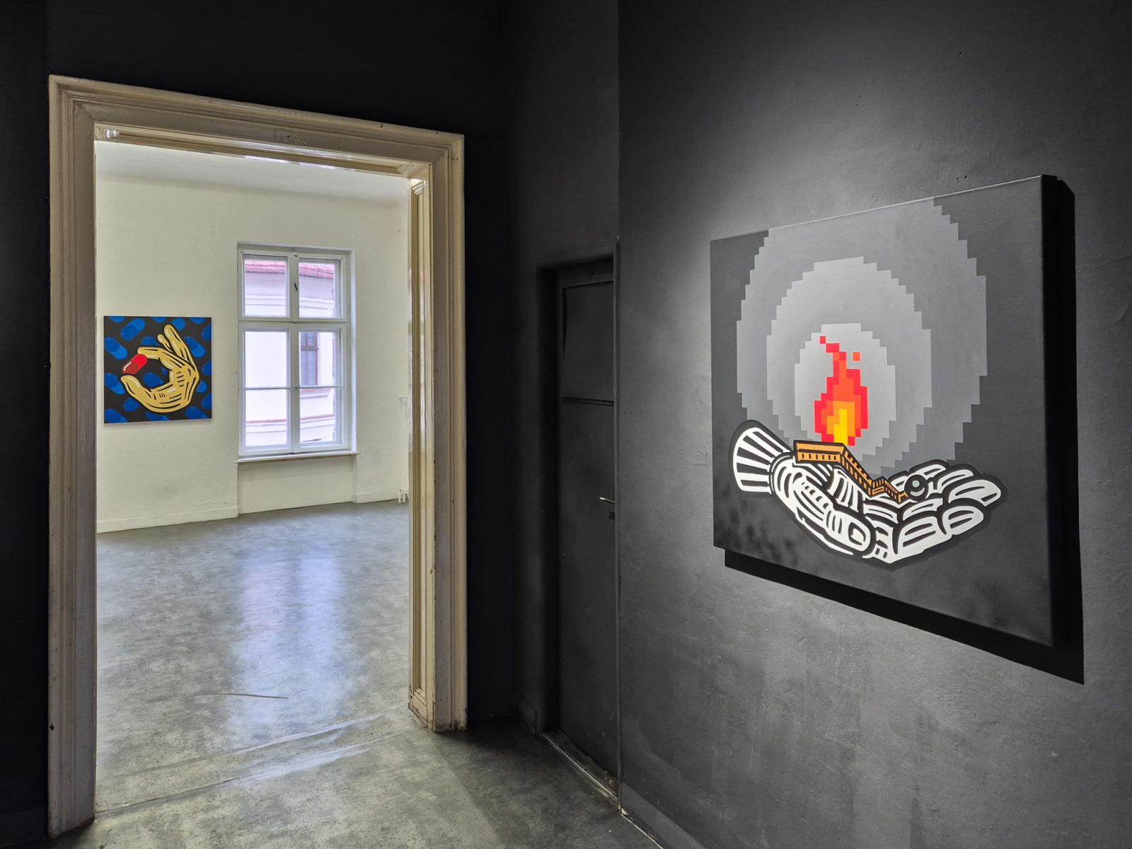 Prvýkrát som tu mala možnosť vidieť naživo spoločné diela Filipa Sabola a Matúša Maťátka. Obaja umelci majú svojrázny, ľahko zapamätateľný rukopis. Ak človek pozná tvorbu oboch, tak veľmi ľahko na spoločných dielach spozná, ktorú časť aký umelec vytvoril. Kým u Filipa prevláda geometrický štýl, u Matúša sú zas očividné hrubé línie pripomínajúce drevoryt. Spoločne sa však tieto dva rukopisy nebijú, práve naopak, pekne sa dopĺňajú.